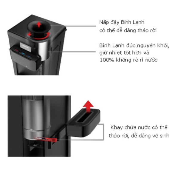 Cây nóng lạnh còn thiết kế đun nóng bên ngoài. Bình Chứa nước của sản phẩm làm bằng Inox 304, bình Lạnh được thiết kế nguyên khối.