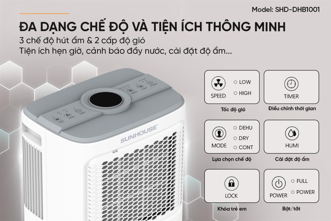 Ngoài 3 chế độ hút ẩm đa dạng, máy hút ẩm Sunhouse SHD-DHB1001 còn tích hợp các tiện ích đi kèm như: hẹn giờ tắt lên đến 24h, cảnh báo tự ngắt khi đầy nước, tùy chọn cài đặt độ ẩm 30 – 80%…. thuận tiện khi sử dụng.