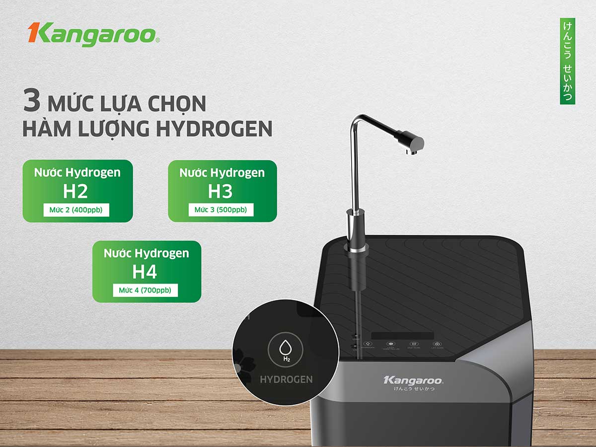 Máy lọc nước Kangaroo KG100EW sử dụng công nghệ tùy chọn Hydrogen độc quyền, giúp tạo nước Hydrogen ion kiềm ưu việt, bền vững với 3 mức Hydrogen khác nhau.